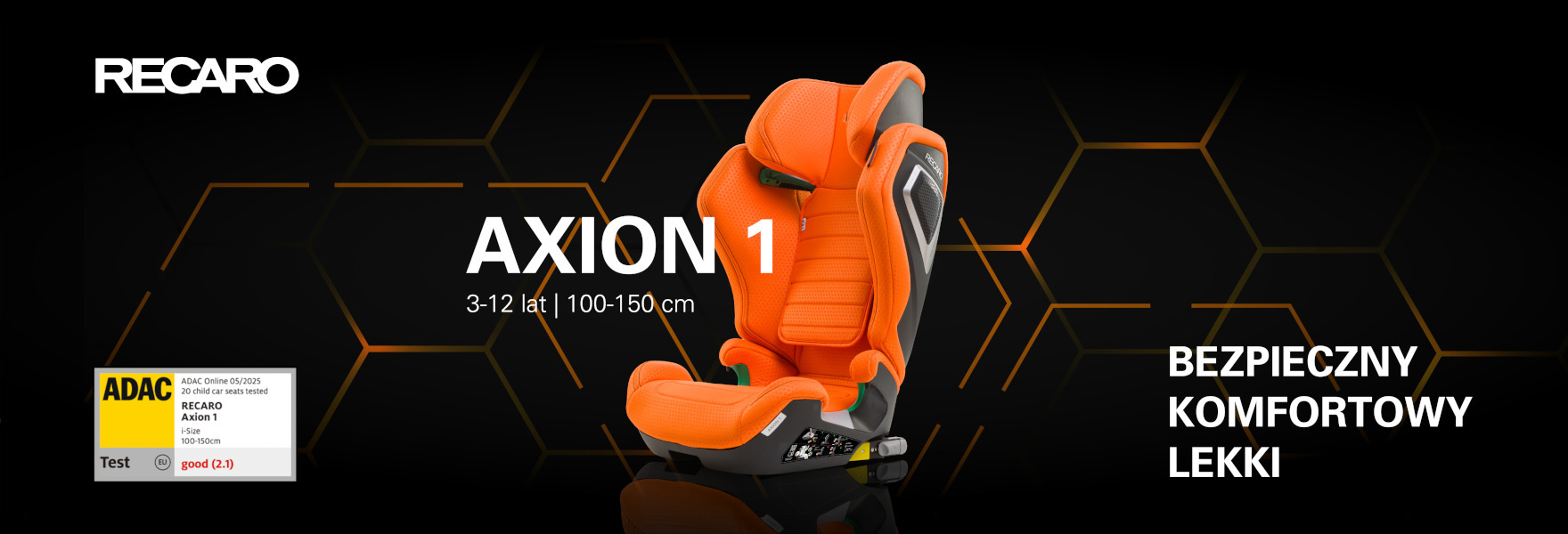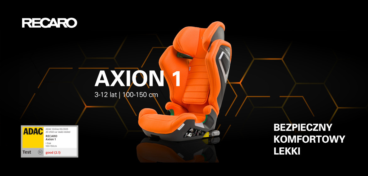 - Recaro Axion 1 – zwycięzca testów zderzeniowych ADAC z 2025 roku w kategorii fotelików od 100 do 150cm wzrostu dziecka.
